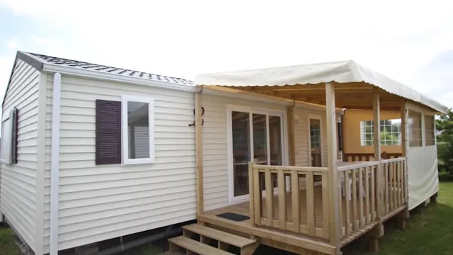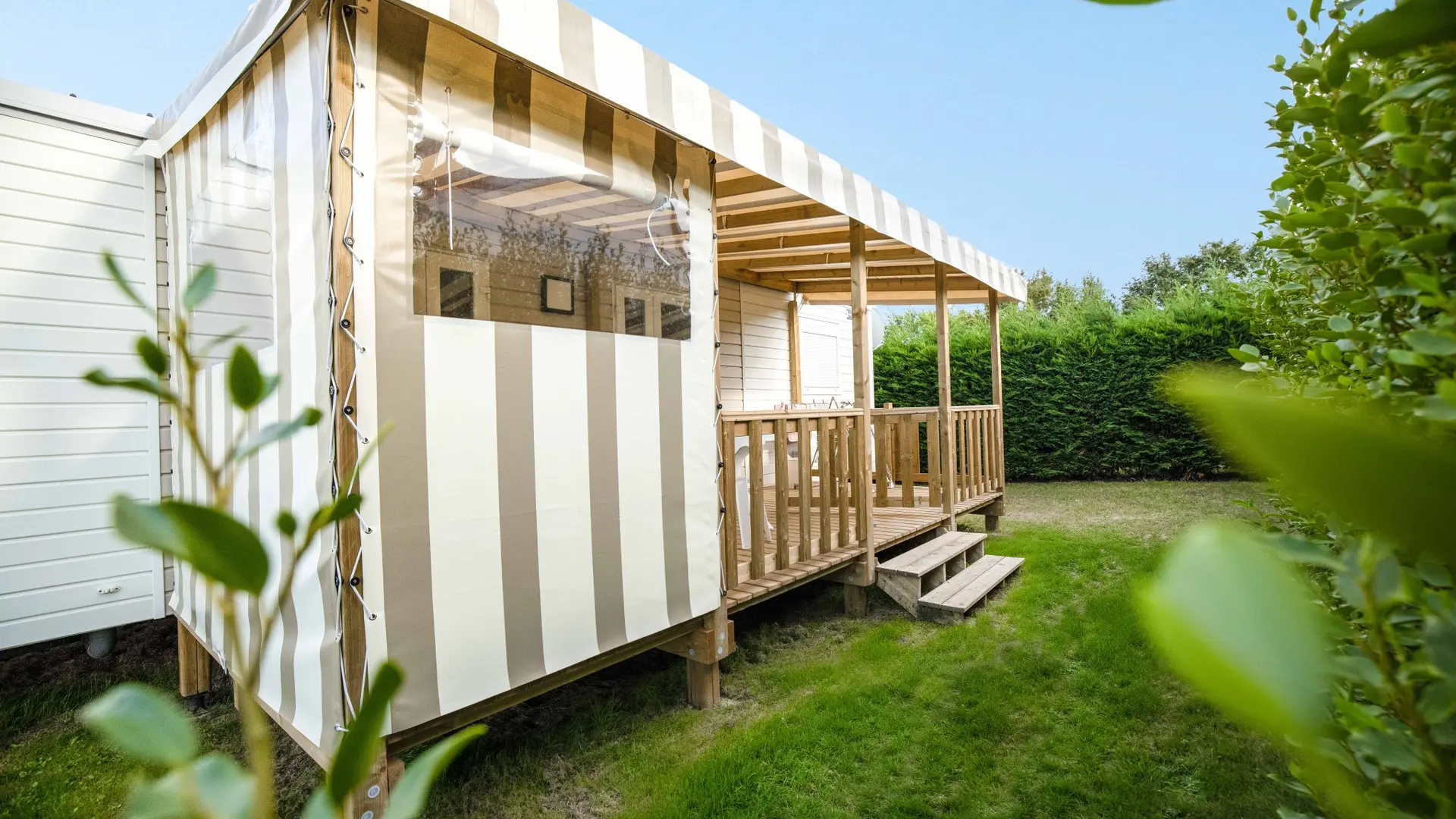 Espace fitness extérieur, jeux pour enfants, mobil-homes confortables et récents sur parcelle de 150 m², vastes emplacements nus, sanitaires.