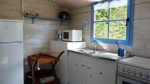 Espace cuisine et repas à disposition. bouilloire, cafetière, micro onde, réfrigérateur et congélateur... Petit déjeuner inclus, servi de 7h45 à 10h avec ses produits faits maison.
