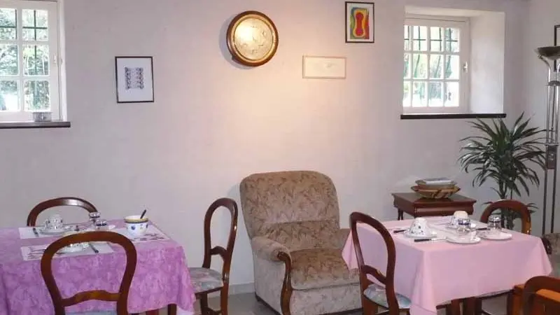 Salon séjour avec bibliothèque à disposition des hôtes, ainsi qu'un office avec réfrigérateur, congélateur, table à repasser, bouilloire électrique, micro-ondes (communs aux chambres).