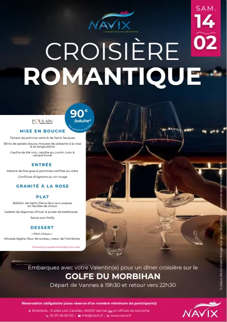 A l’occasion de la Saint-Valentin, NAVIX propose un dîner croisière romantique sur le Golfe du Morbihan au départ de Vannes.