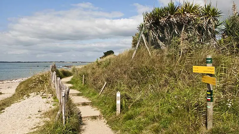 Empruntant le sentier des douaniers sur près de 7 km, ce circuit offre un panorama unique sur les fameuses falaises de la Mine d’or puis sur l’embouchure de la Vilaine, où se mêlent eaux douces et eaux salées. Aujourd’hui, les bouchots soigneusement alignés, semblent garder l’entrée du fleuve. Après avoir longé l’estuaire, prolongez votre balade à travers le bocage avant de regagner la petite station balnéaire.