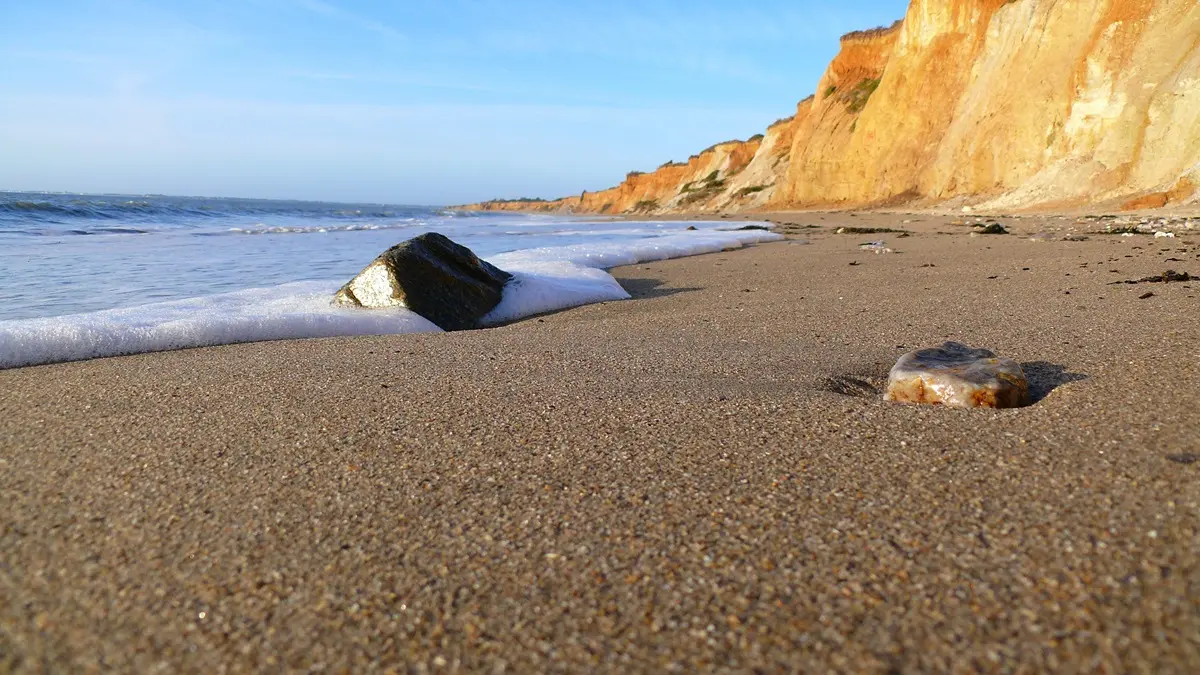 2- Prenez en face, puis sur le sentier littoral, dirigez-vous sur la droite. Vous bénéficierez d’une superbe vue sur les falaises de la Mine d’or. Ce site géologique classé, unique en Europe, doit son nom au précieux métal présent dans les sables de la falaise et exploité pendant quelques années à la charnière des XIXe et XXe siècles.