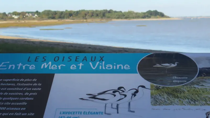 6- Poursuivez route de Tréhiguier sur environ 600 m. À ce niveau, 2 panneaux d’interprétation vous invitent à découvrir les espèces qui font la richesse des rives de Vilaine : Courlis cendrés, Tadornes de Belon, Avocettes élégantes et autres Bernaches. Sur votre gauche sont implantées plusieurs fermes mytilicoles.
