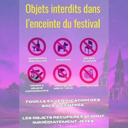 Objets interdits dans le festival : Boissons, bouteilles/gourdes, nourriture, animaux, sièges pliants, casque de moto/vélo, armes et objets contendants.