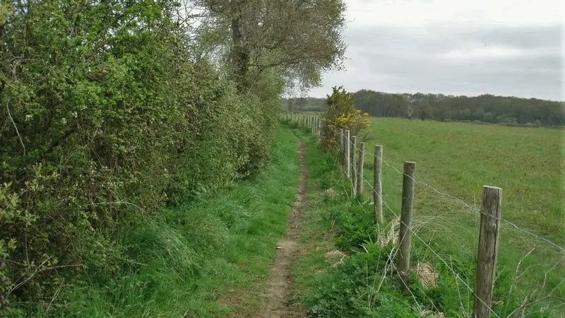 3 Passez sous le pont et dirigez-vous vers un petit chemin entre une pâture et un champ qui se trouve en face, légèrement à gauche. Attention, il peut être humide après un épisode pluvieux. Suivez ce chemin jusqu’à la route, engagez-vous sur cette route, puis à la patte-d’oie, prenez le chemin à gauche. Traversez la route du Bois Chevalier et continuez tout droit.
