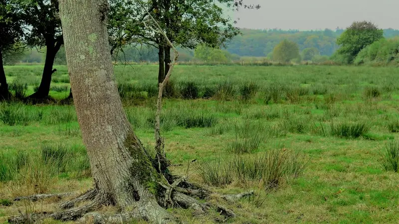 5 Continuez sur le chemin de remembrement puis au bout de 300 mètres, prenez à droite le sentier à travers les sous-bois. Après avoir franchi la passerelle, traversez une prairie. Vous entrez dans une zone de pâturage : veillez à tenir votre chien en laisse et respecter la quiétude des animaux en restant à distance du bétail. Au bout, tournez à droite pour prendre