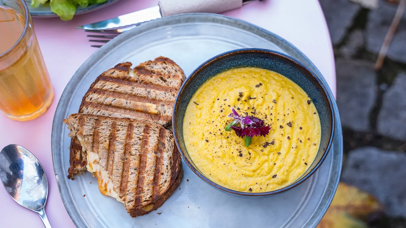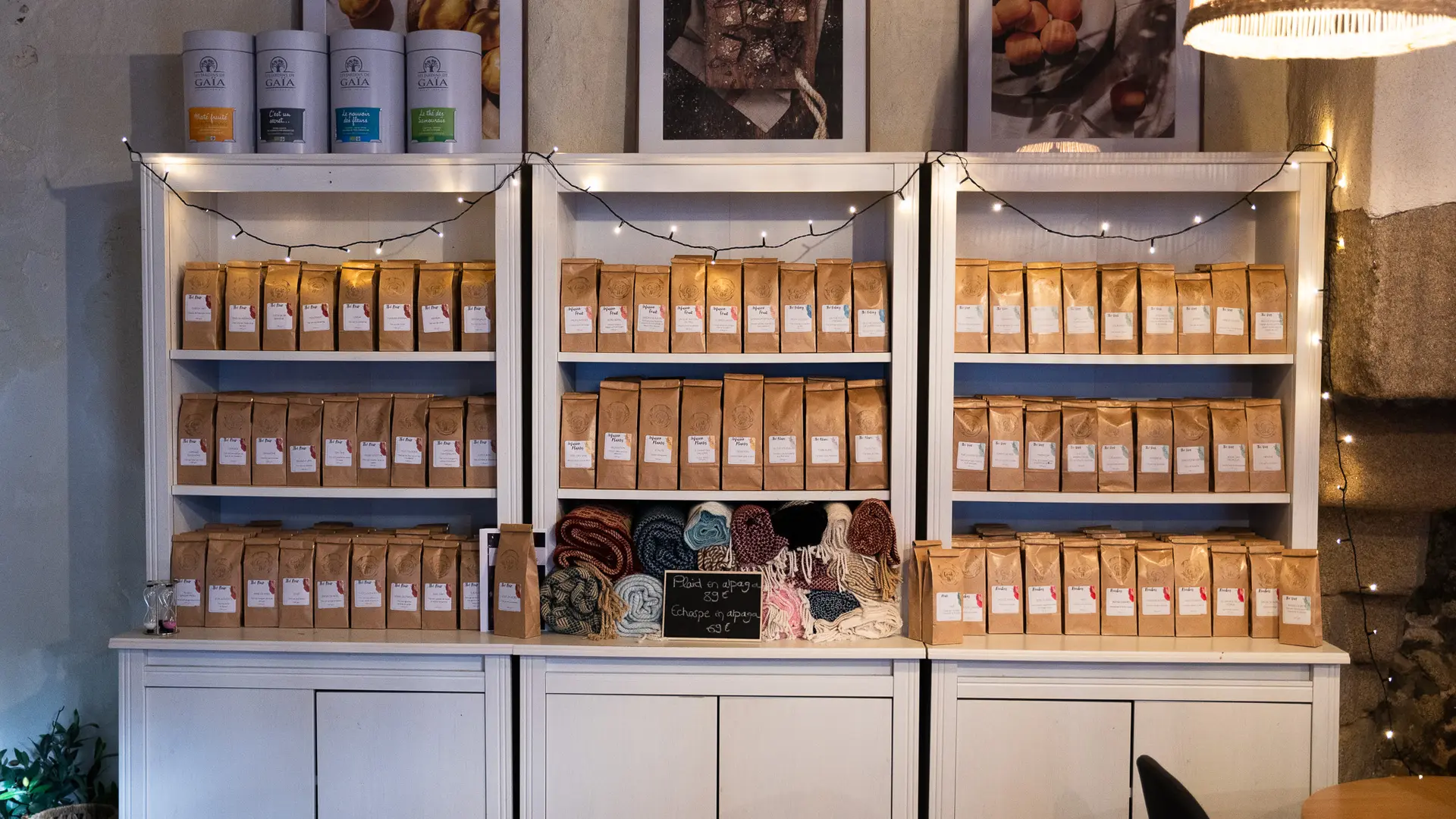 Nous cuisinons des produits frais, locaux et de saison : tartine, velouté, salade, pâtisserie, le tout accompagné d’un thé que vous pouvez également retrouver en boutique.