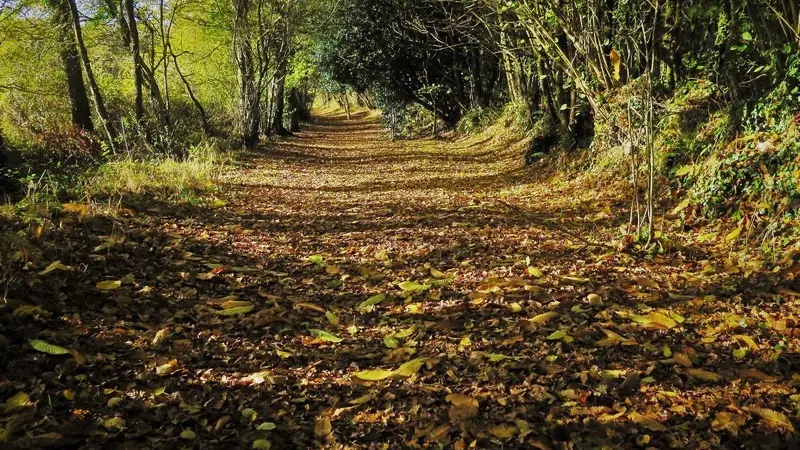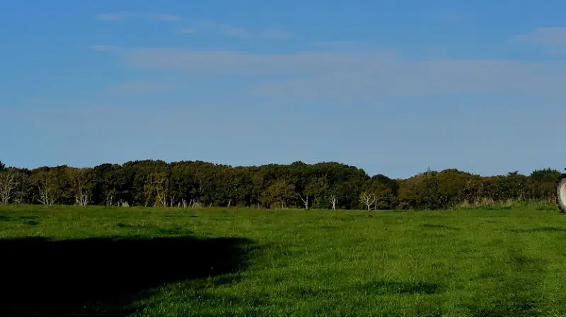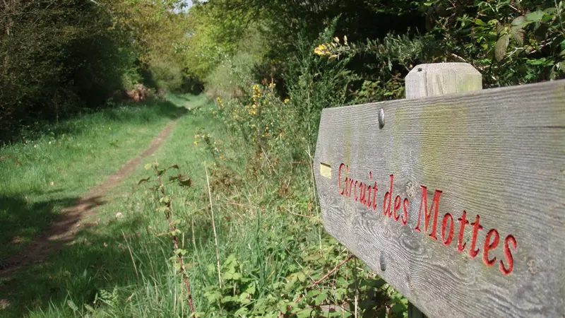 4- Au croisement suivant, prenez la route à droite puis, à la patte-d’oie, le chemin de gauche. Au croisement, dirigez-vous à droite et continuez jusqu’à la route. Tournez à gauche et prenez aussitôt à gauche avant le calvaire le chemin de la Ville Mouée puis à droite. Continuez sur ce chemin qui peut être humide après un épisode pluvieux jusqu’à la route de Coicas. Au niveau de la ferme, prenez le chemin étroit sur votre gauche.
