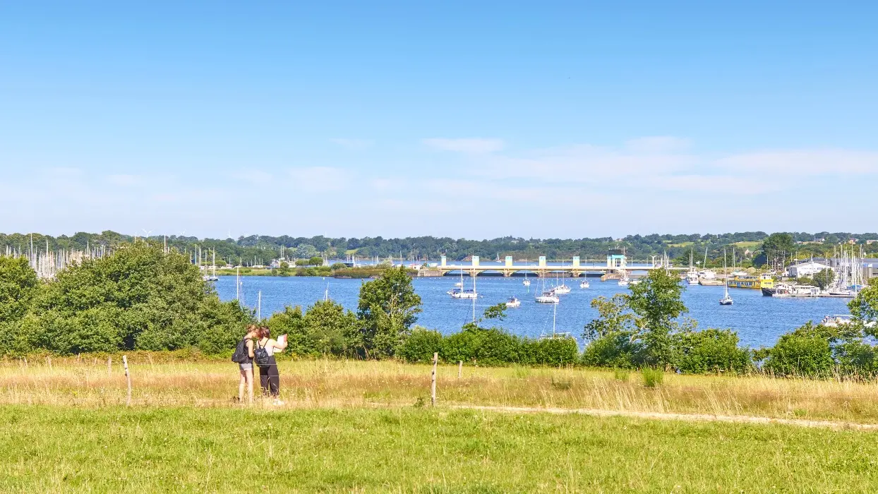 2- Traversez la RD 139 et prenez un petit chemin sur la gauche qui vous conduit vers le port de plaisance d’Arzal-Camoël. Descendez l’escalier en bois qui vous mène à l’entrée du port. Écartez-vous légèrement du circuit, traversez la route, grimpez en face sur la butte aménagée de tables d’orientation pour faire une pause et bénéficier d’une vue exceptionnelle sur le barrage.