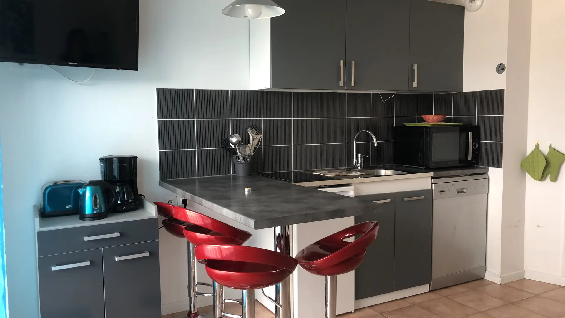 Combiné four / micro-ondes. Plaques induction (vaisselle adaptée fournie). Lave-vaisselle. Réfrigérateur. TV TNT HD. Vaisselle et petits accessoires à disposition : bouilloire, grille pain, cafetière, fer à repasser aspirateur, etc... Placard avec penderie.