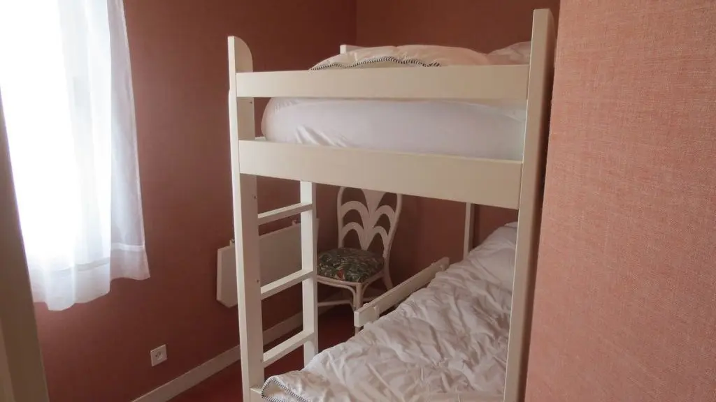 1 chambre parentale 10,5 m² comprenant un lit double (160 x 200), et une petite chambre équipée de lits superposés. Un lit parapluie et une chaise bébé sont mis à disposition si besoin.