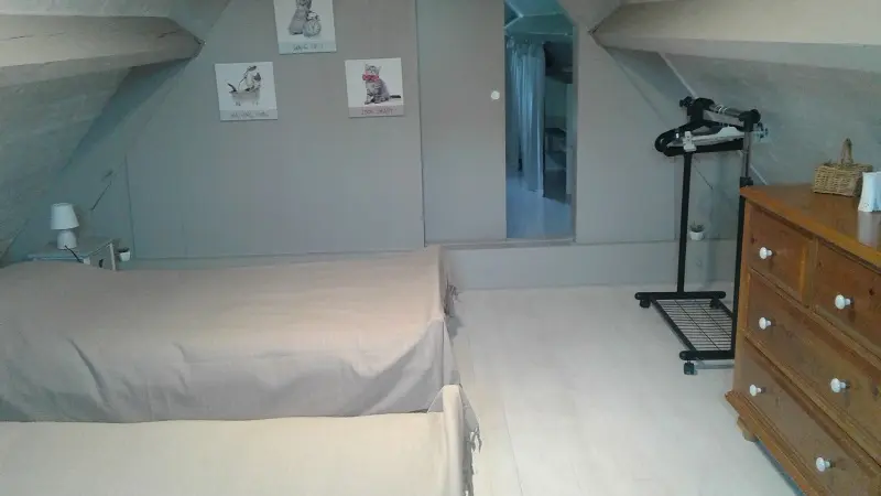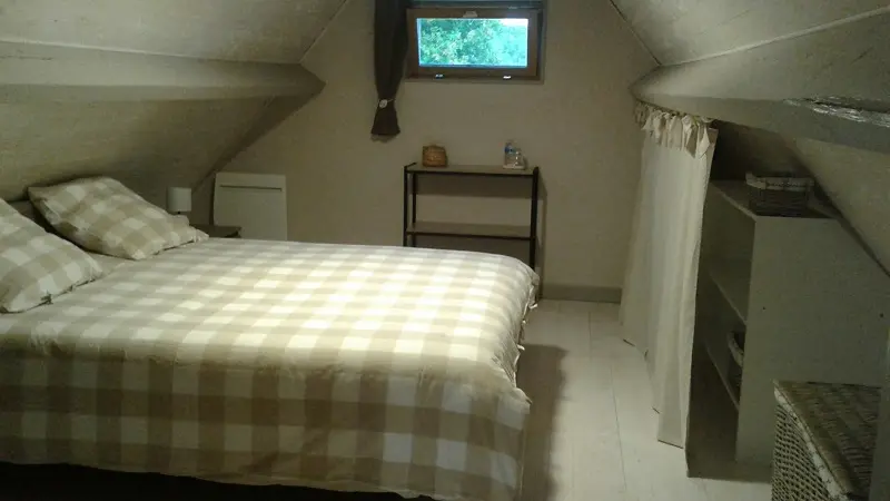 A l'étage : accès par escalier intérieur, deux chambres mansardées en enfilade dont une ouverte avec quatre lits 80 (grand lit 160 possible), penderie/commode et une chambre fermée avec lit 160, penderie/étagères.