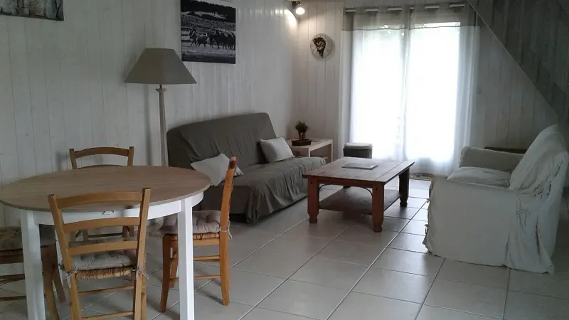 Au rez de chaussée : une petite cuisine équipée avec frigo congélateur, plaque vitrocéramique et hotte, petit four et four micro-ondes, évier et lave-vaisselle, grille-pain, bouilloire, cafetière, vaisselle... Salle d'eau avec WC, lavabo et douche. Living avec 2 canapés, 2 tables basses, 1 table ronde, 4 chaises, télévision murale. Accès terrasse extérieure avec table, 4 chaises, fauteuils de jardin.