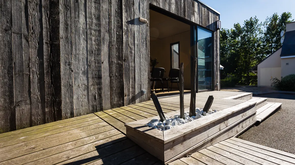 A l'extérieur : une terrasse dallée, un salon de jardin, deux "chiliennes" - un cellier pour ranger vélos, accessoires de pêche, etc..