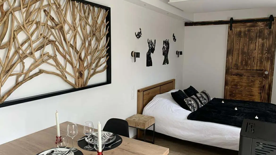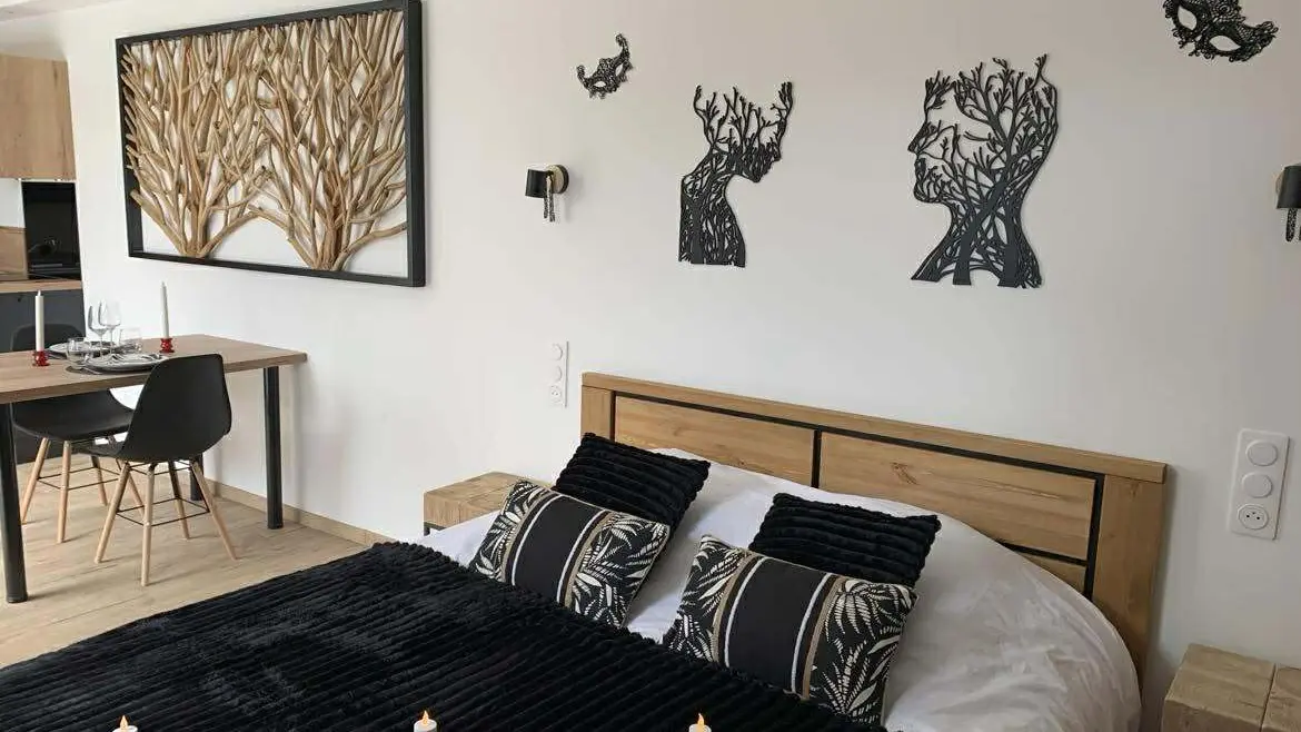 Oubliez le quotidien et profitez de ce condensé de plaisir à partager en couple, avec un accès direct à sa grande terrasse privative. La décoration dans les tons noirs et bois apportent un côté secret et mystérieux.