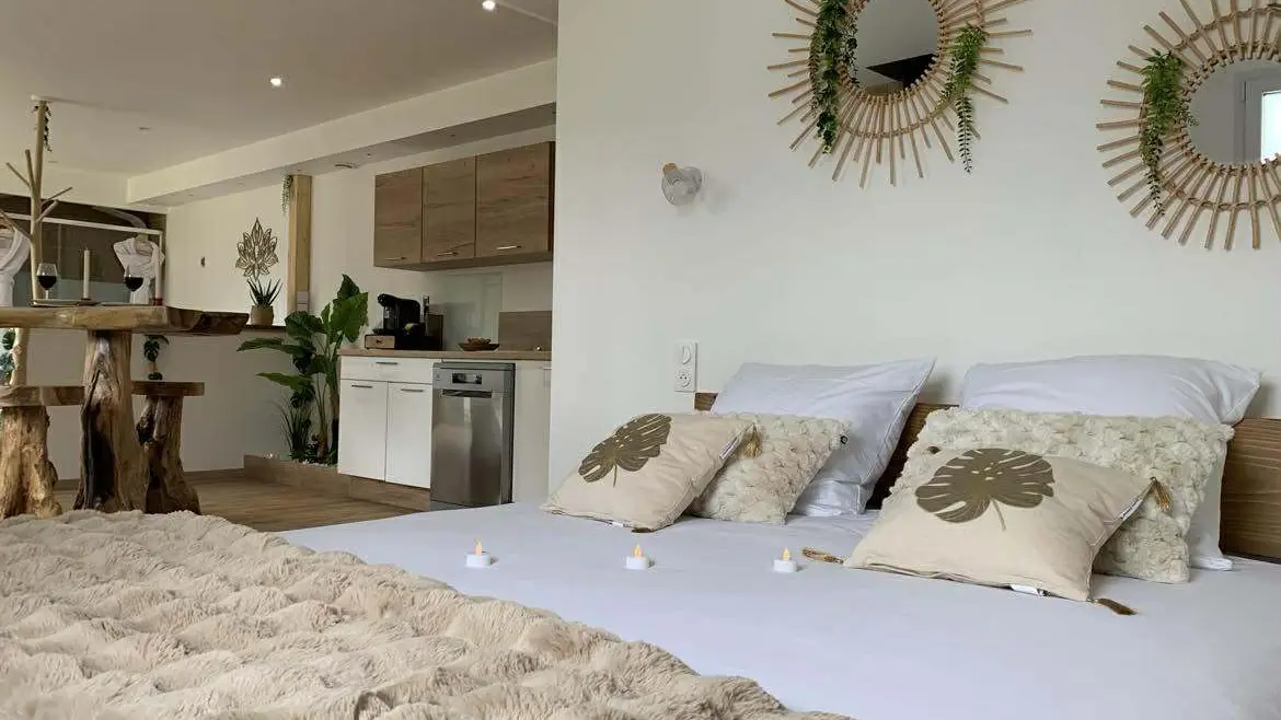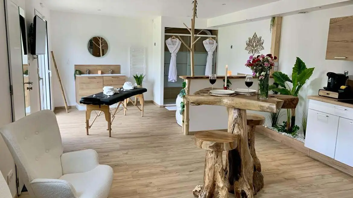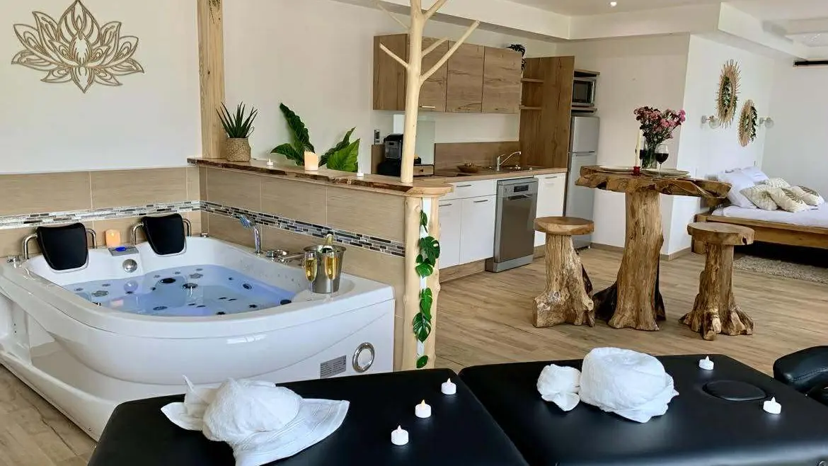 Dès votre arrivée, succombez au charme de ce lovegite d’exception de 40 m² prévu pour deux personnes majeures, soigneusement aménagé, équipé d’une baignoire balnéo deux places chauffée à 38° et accessible de façon illimitée, ou vous pourrez vous détendre, d’une douche sensorielle duo avec jeux de lumières intégrés et d’une table de massage. Relaxez-vous et profitez.