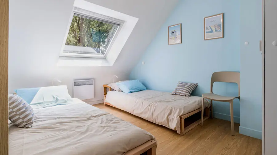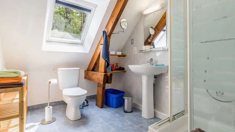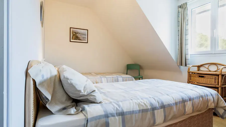 A l'étage : 3 chambres (1 grande chambre avec coin bureau : lit 160x200, 1 chambre mansardée : 2 lits 90x190, 1 petite chambre mansardée : 2 lits 90x190) et salle d'eau/WC.