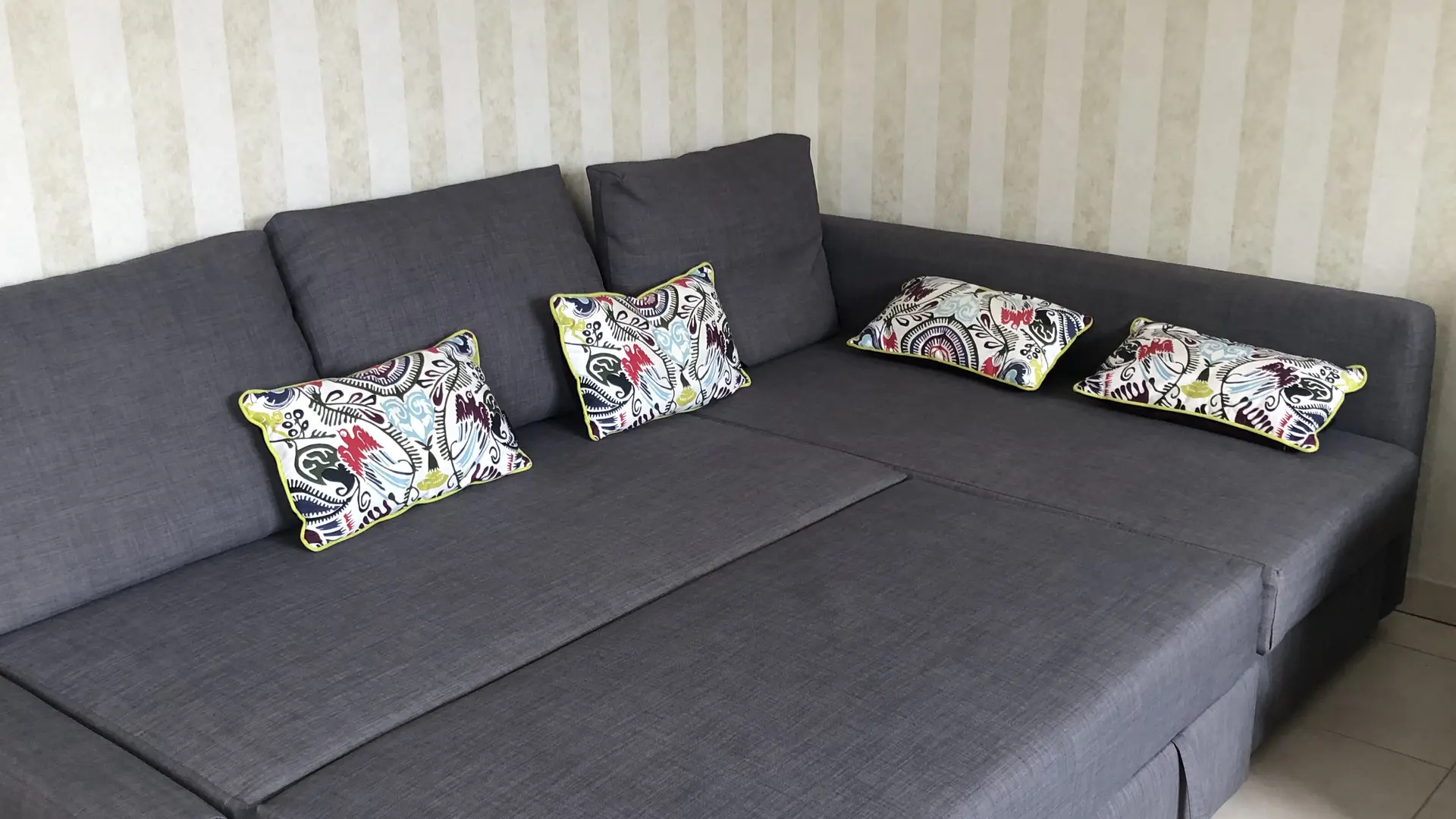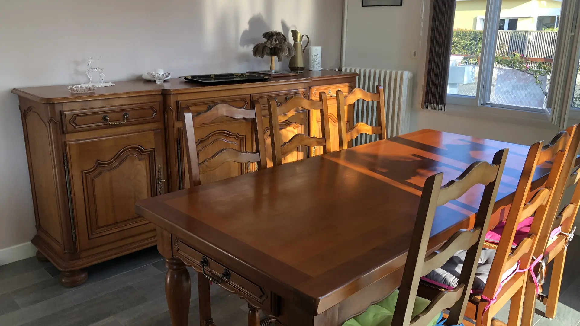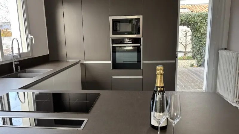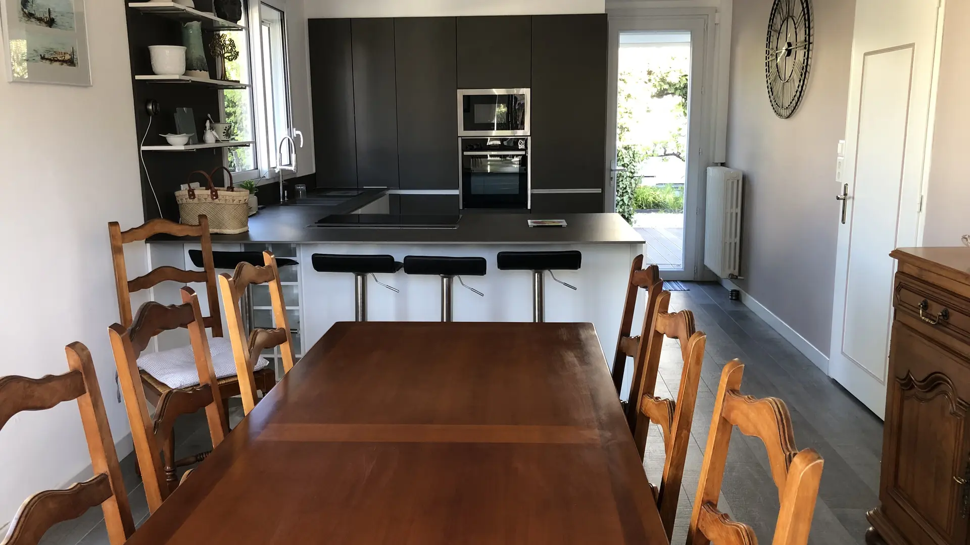 La cuisine-séjour est moderne et donne sur une large terrasse. Un grand salon peut être privatisé et servir de lieu de travail ou de couchage avec un divan 2 places convertibles.