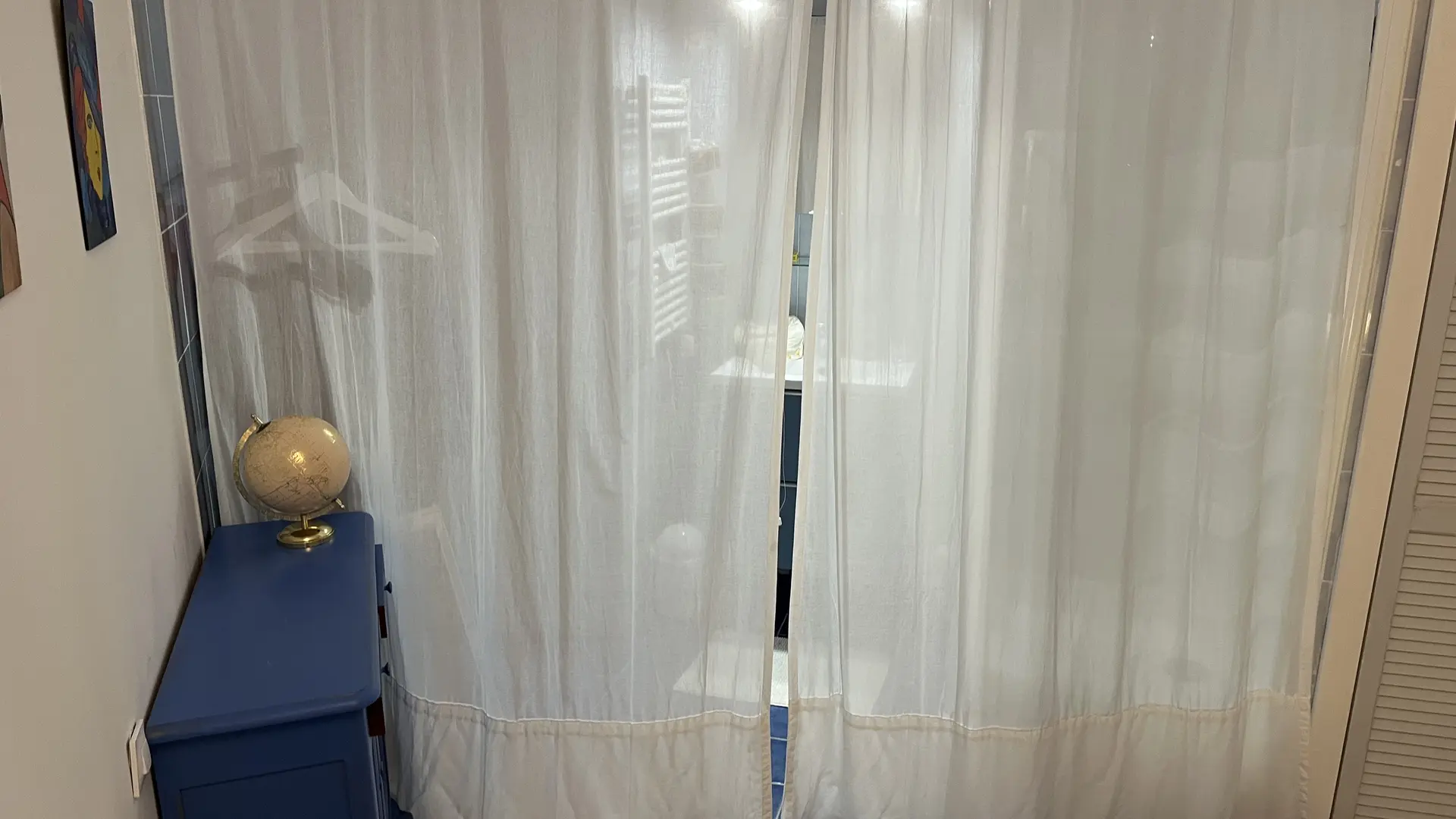 L’accès à la salle d’eau se fait depuis la chambre grâce à des rideaux élégants, tandis que la douche est fermée par une porte pour préserver l’intimité.