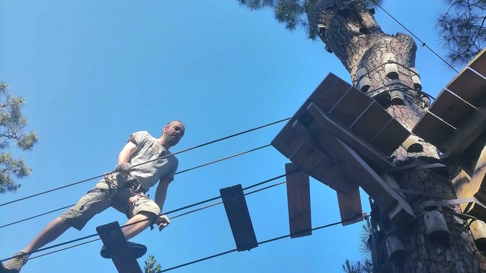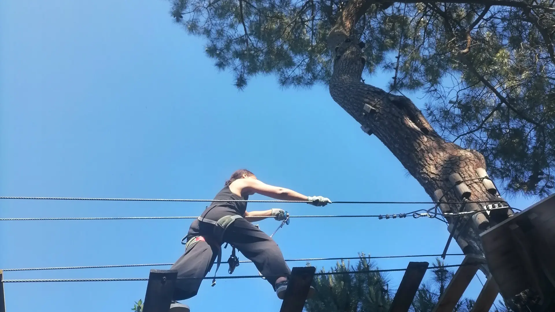 Enfants de moins de 8 ans obligatoirement accompagnés par un adulte équipé qui grimpe dans les parcours.