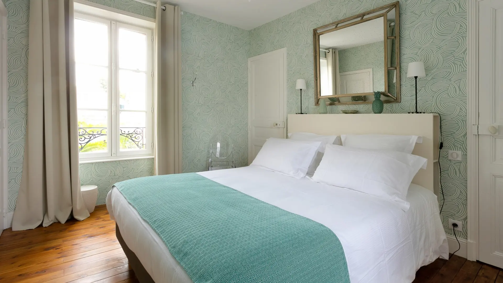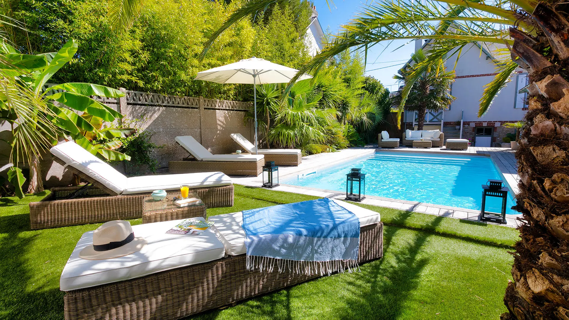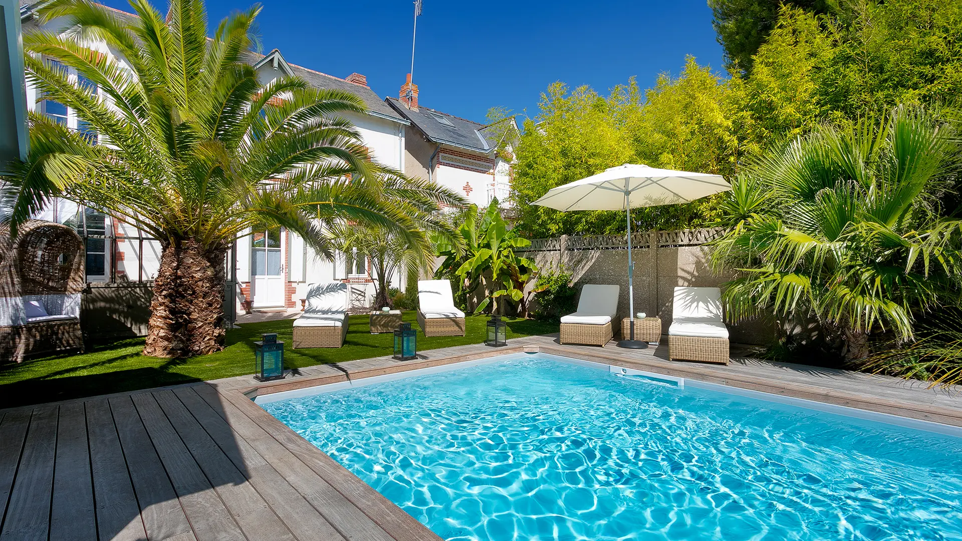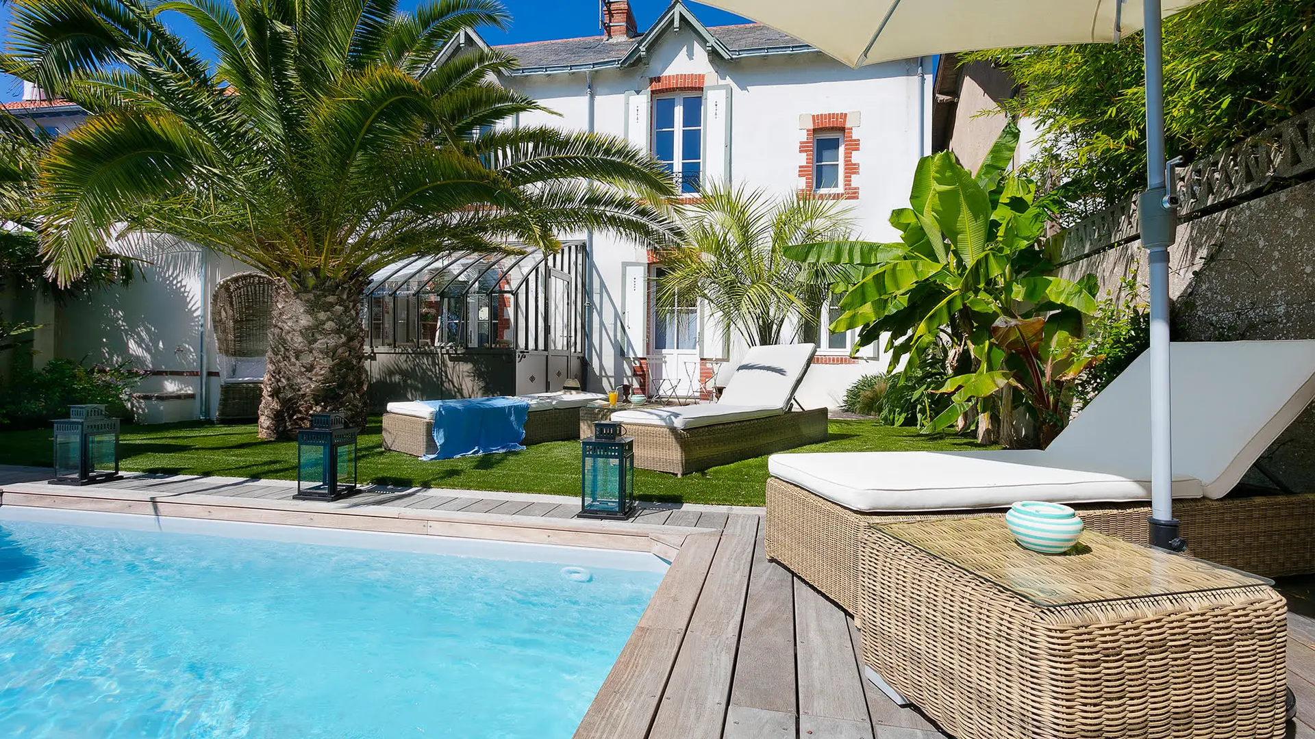 Au cœur du quartier Benoit, la Villa la Ruche est une villa typique Bauloise du début du XXème siècle, récemment rénovée dans le souci du confort moderne et le soin d'une décoration chaleureuse. Tout en étant au calme, elle est à proximité de tout (mer et commerces à 100 m, gare à 2 km). Piscine chauffée d'eau salée non couverte (juin/sept) au coeur d'un jardin aux plantations éxotiques. 3 chambres avec accès indépendant, chacune avec salle d'eau, wc privatif et TV: 1 en rez-de-jardin (2 lits 90x200 jumelables) et 2 à l'étage (lits de 160x200). wifi. Délicieux petit-déjeuner réalisé avec des produits maison et servi dans la serre.