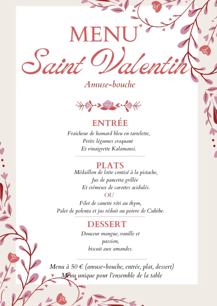 Retrouvez notre menu Saint Valentin en suggestion au déjeuner du 14 et 15 février et menu unique le 14 février au diner.